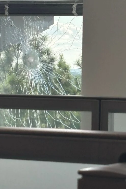 WABE spoke with a CDC employee who provided photographs of a window in Building 24 that had been damaged by gunshots.